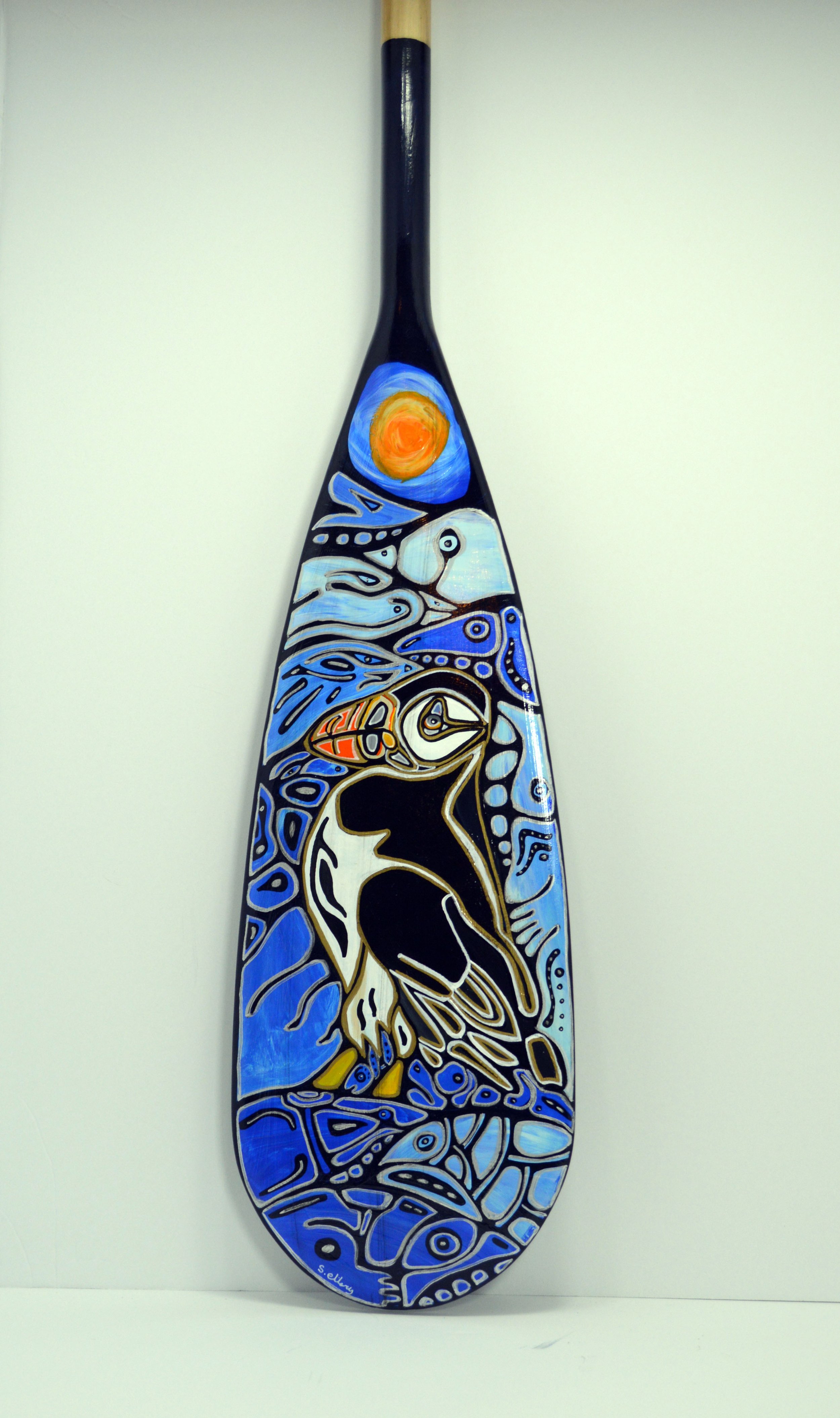 When it was over, I spent hours drawing strange abstract creatures on skateboards and wooden canvases. I began drawing the abstract style within animals’ fur and feathers, using them as containers for my cartoony creatures. I continued to do this digitally. I started painting on canoe paddles and cutting boards. My style became simple and less cartoony; I used colour more often.
